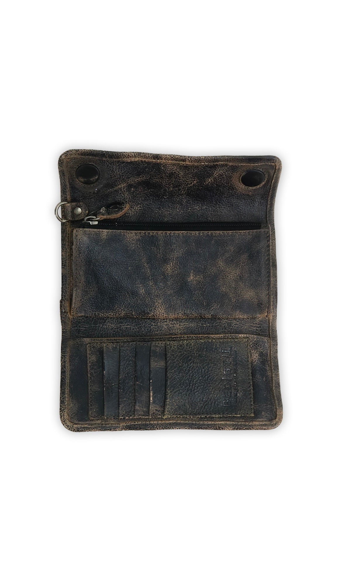 - Interior contains 1 zippered pocket, 1 slip pocket, and 6 credit card slots
