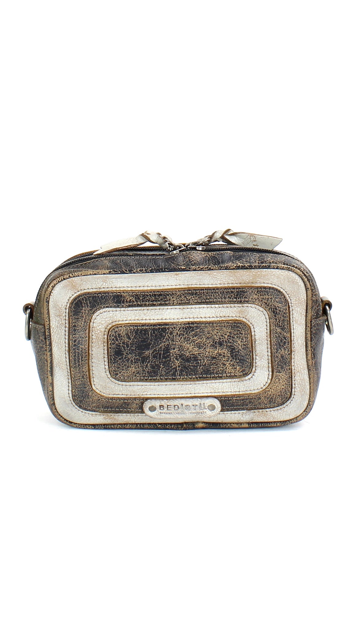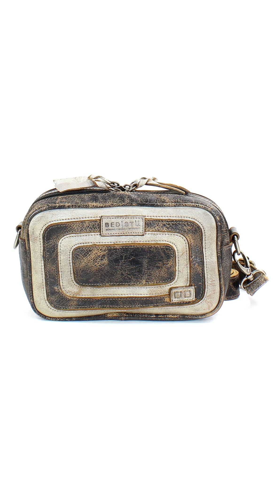 - Two-toned rectangular crossbody with leather overlays and piping for dramatic stand-out style