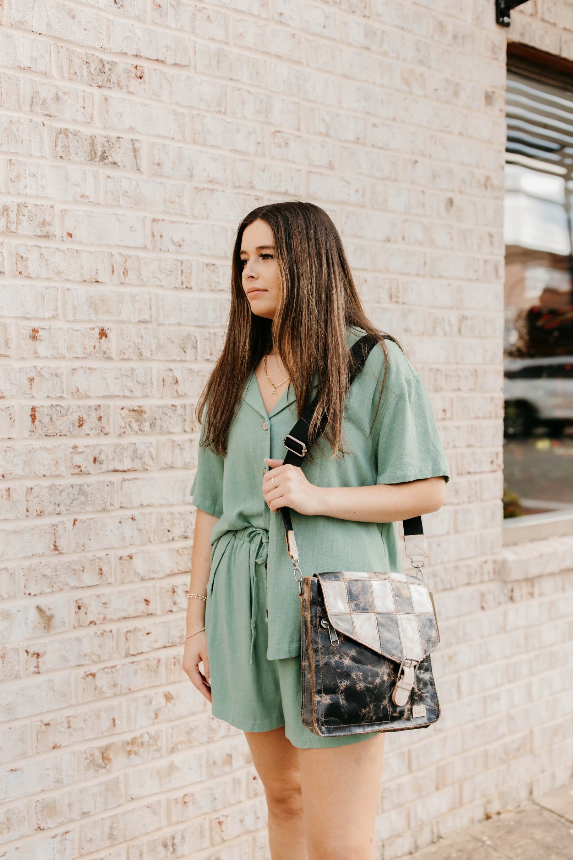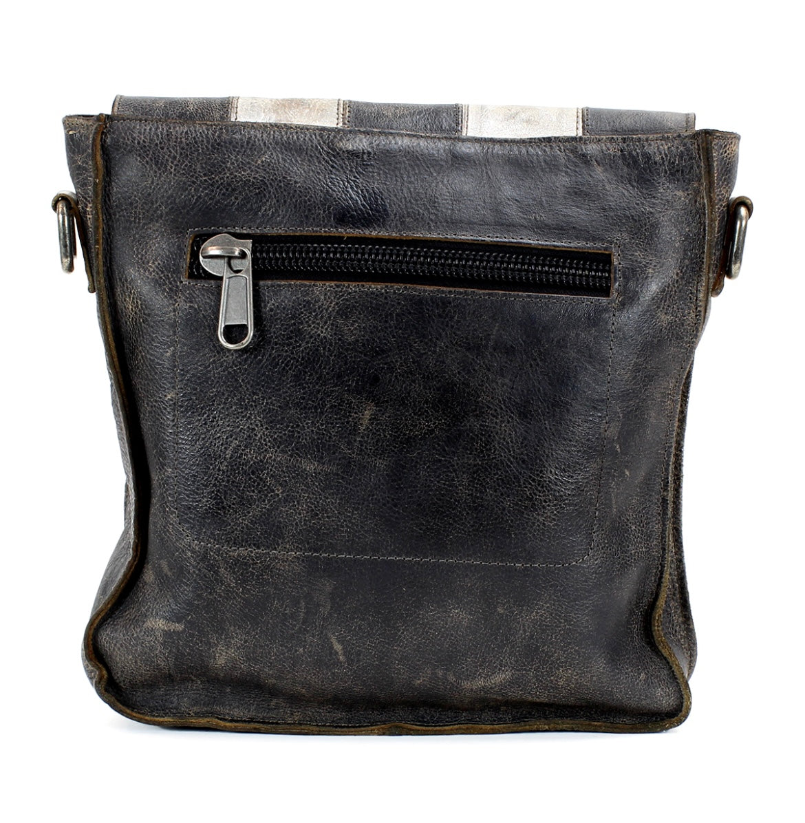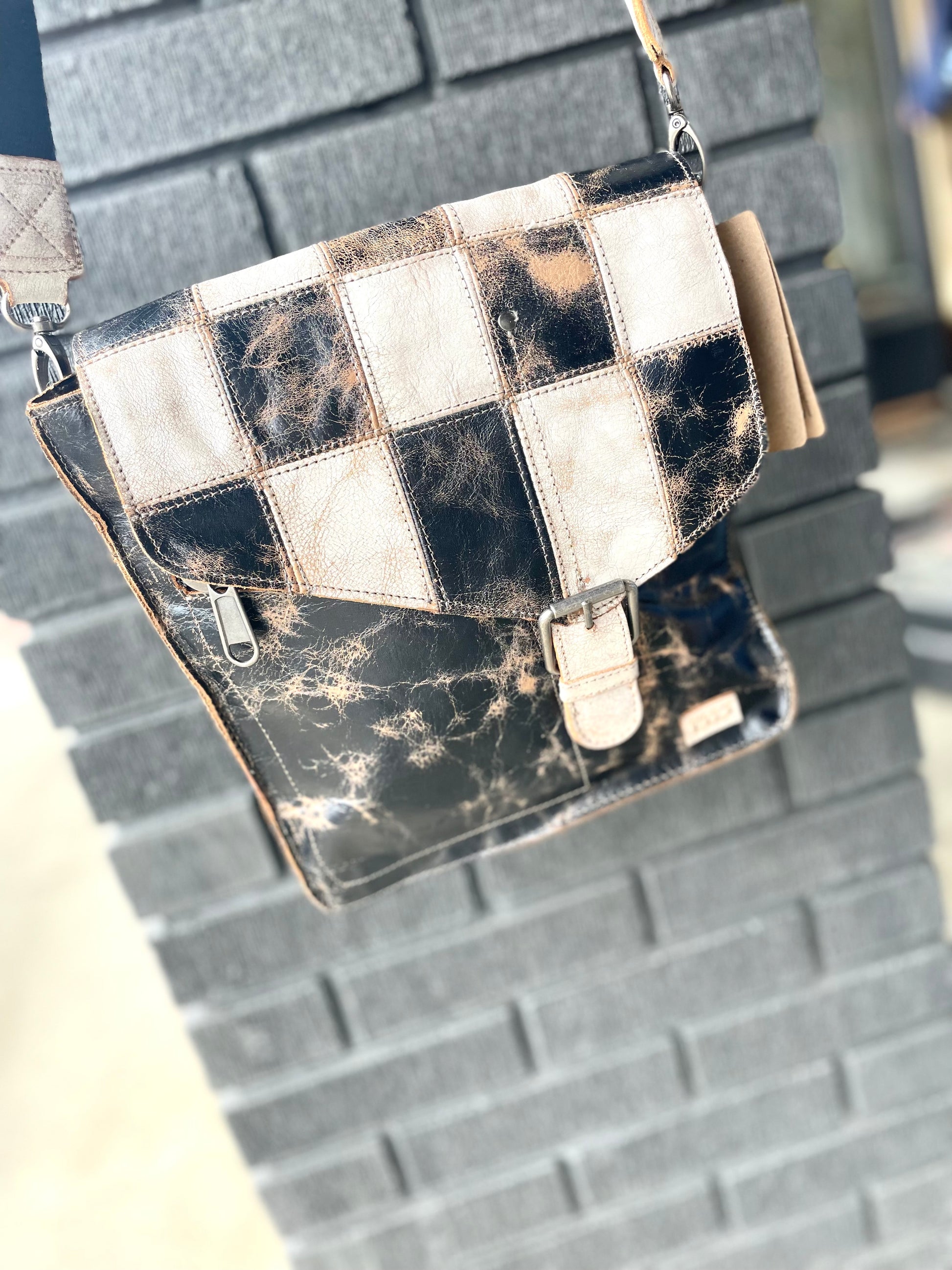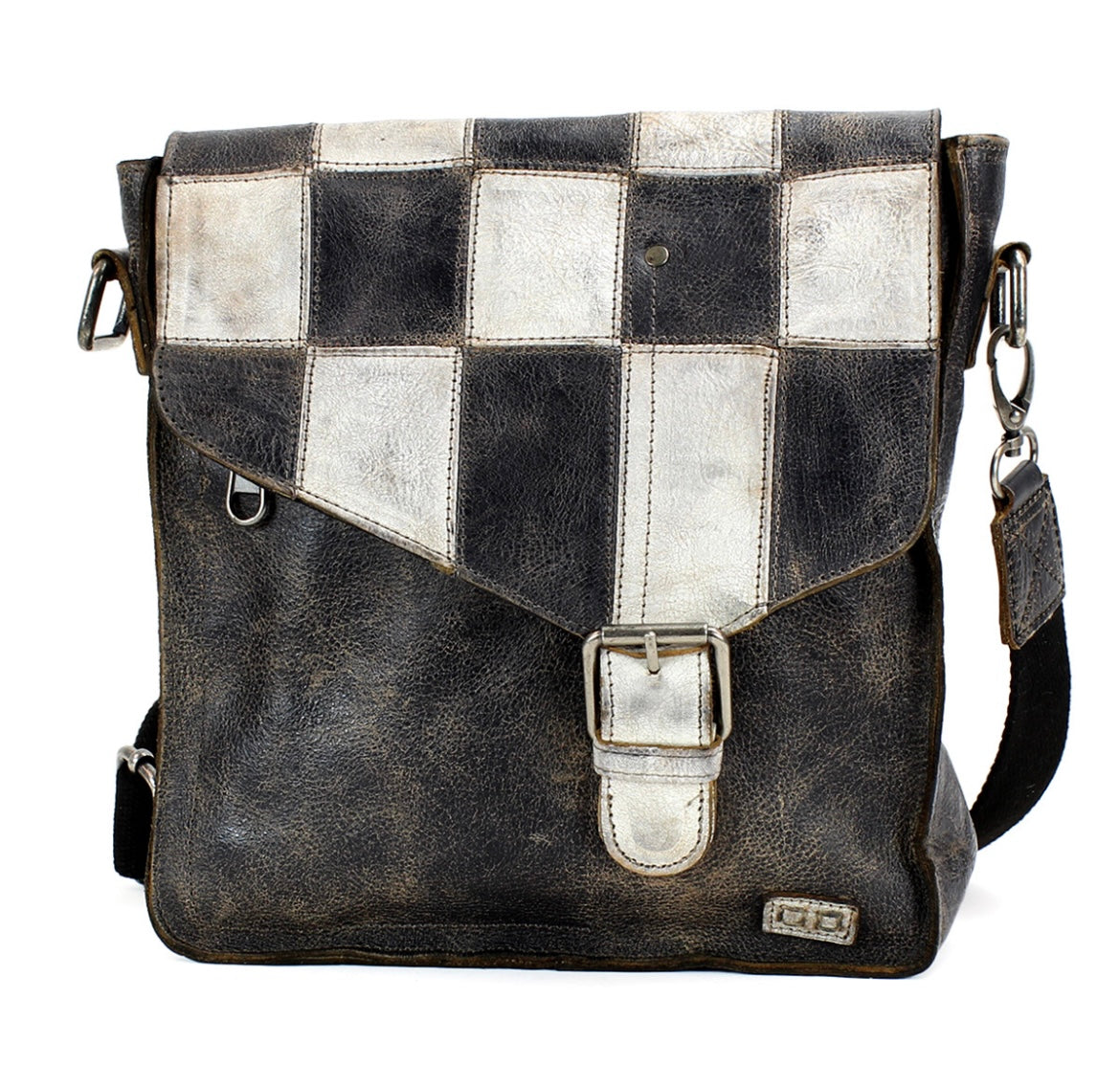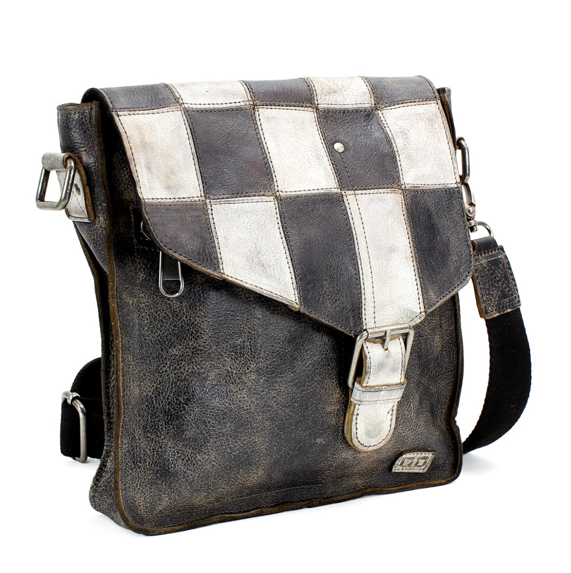 - Functional flap opening with heavy hardware buckle closure