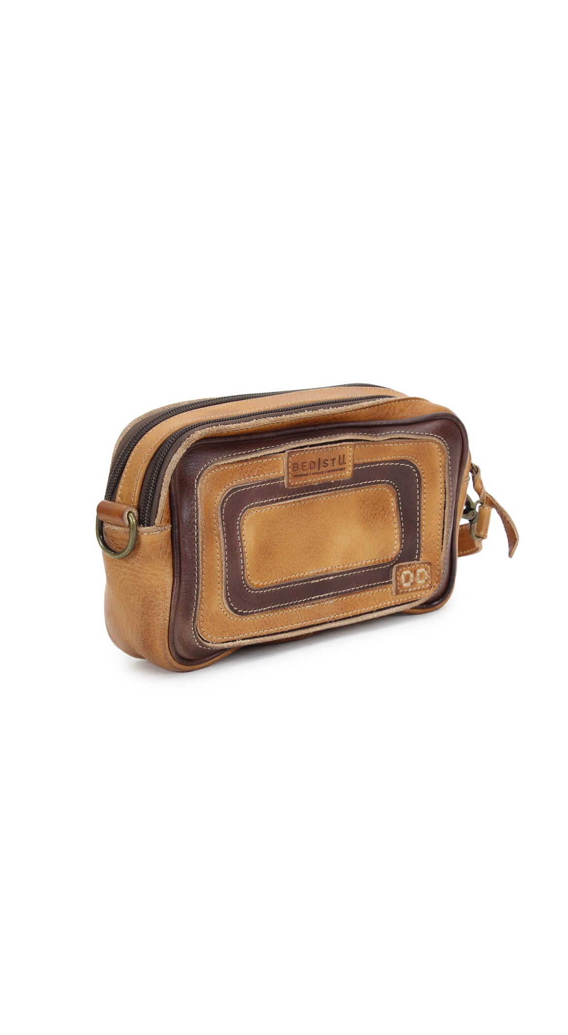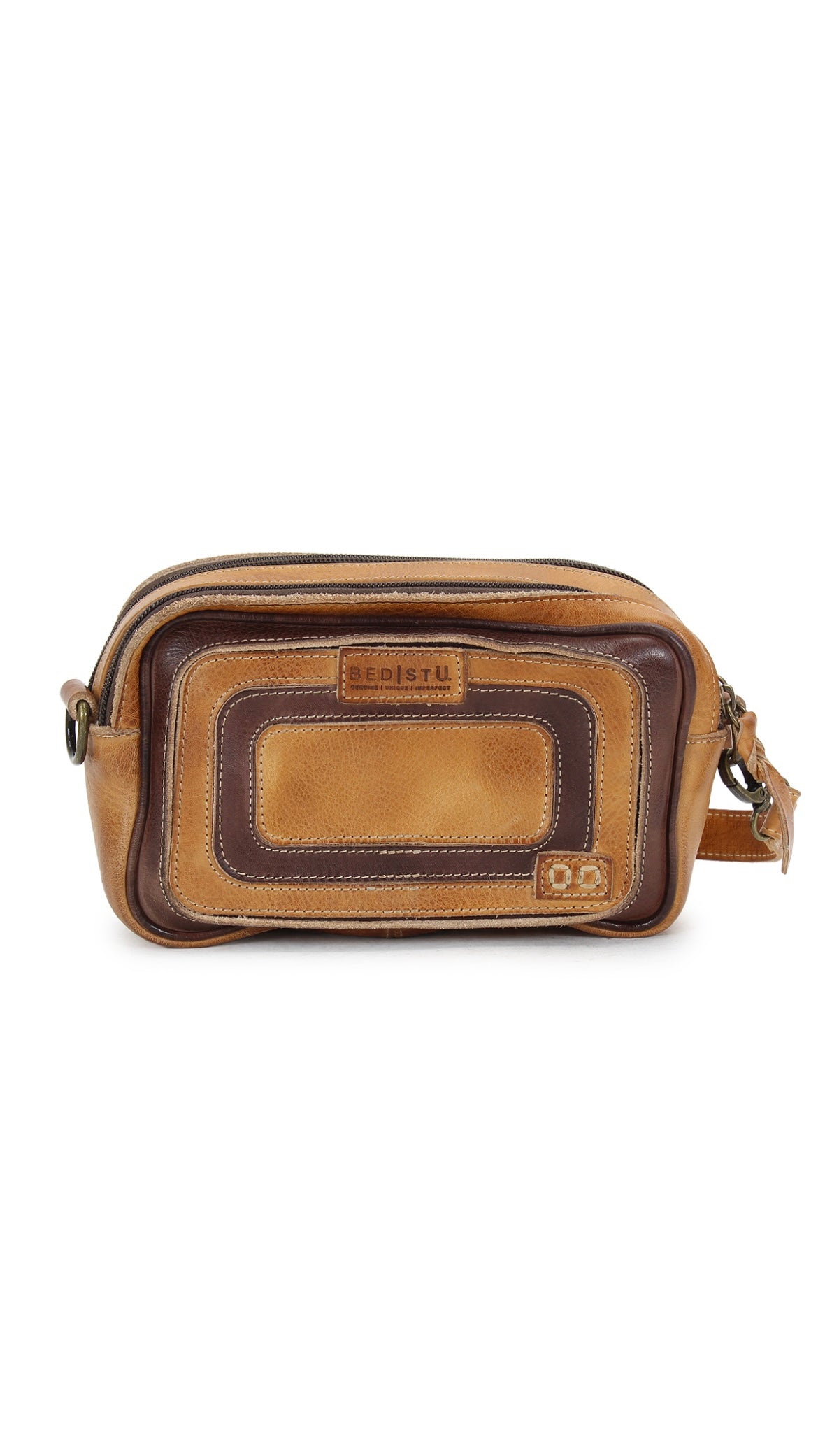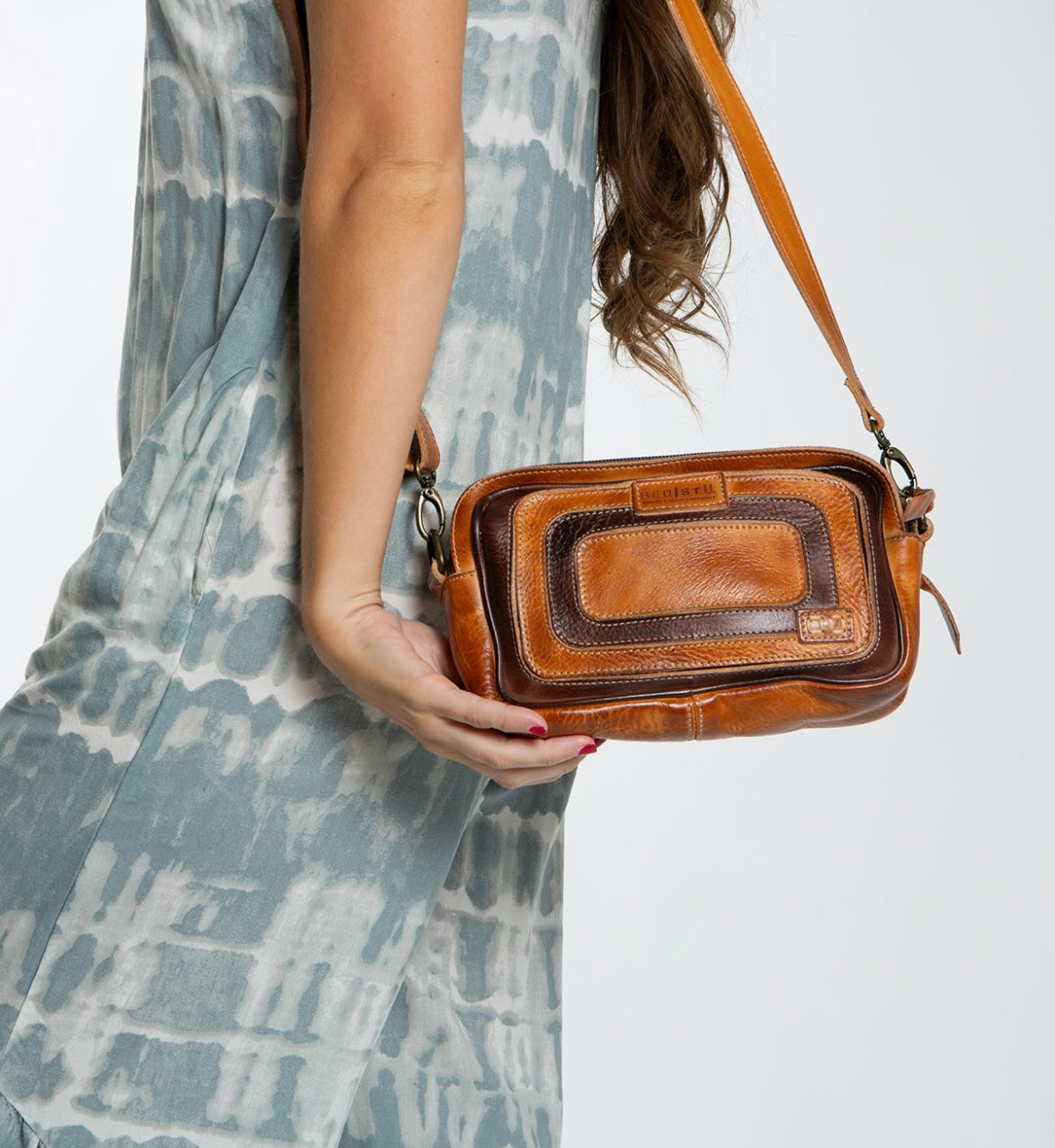 - Two-toned rectangular crossbody with leather overlays and piping for dramatic stand-out style