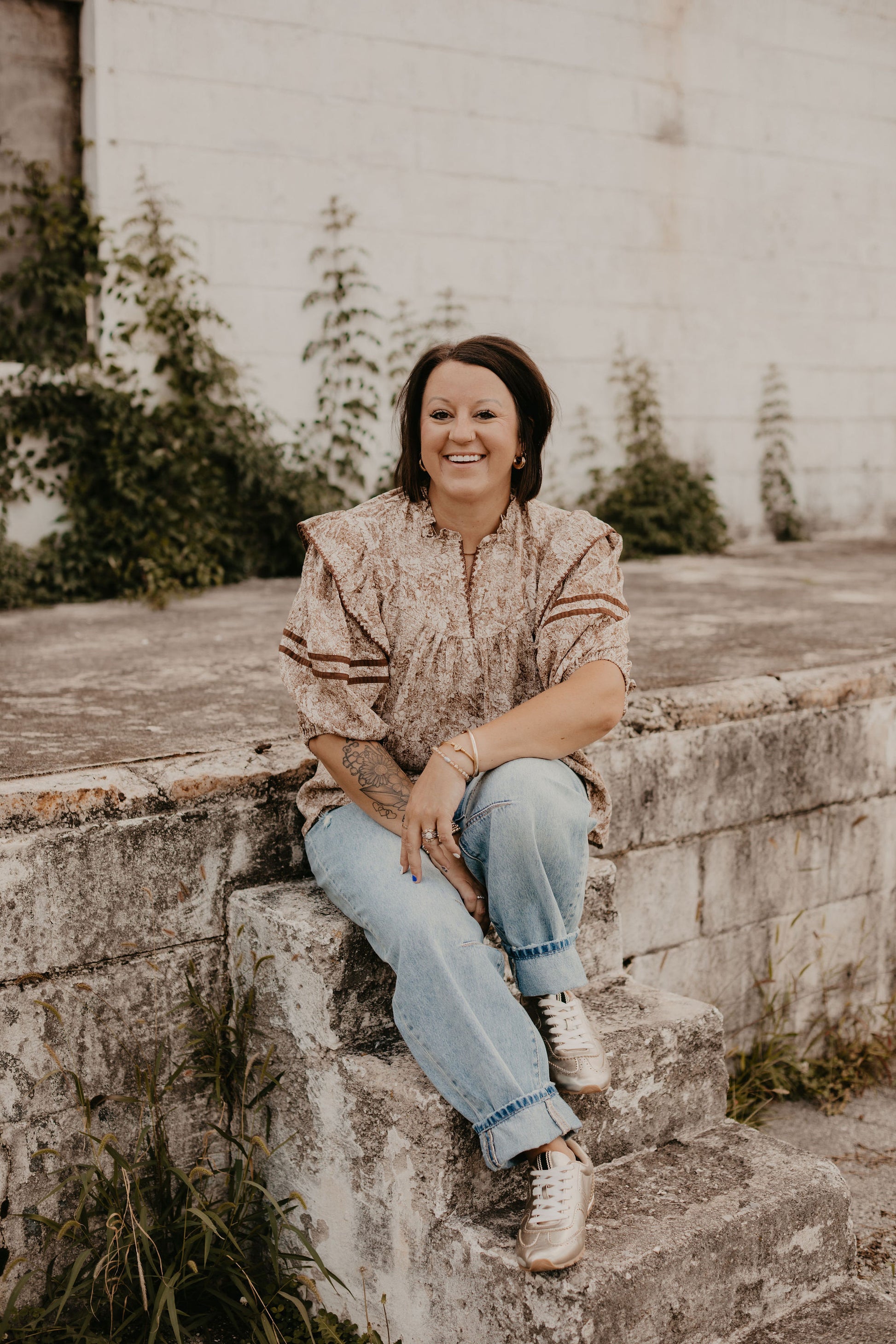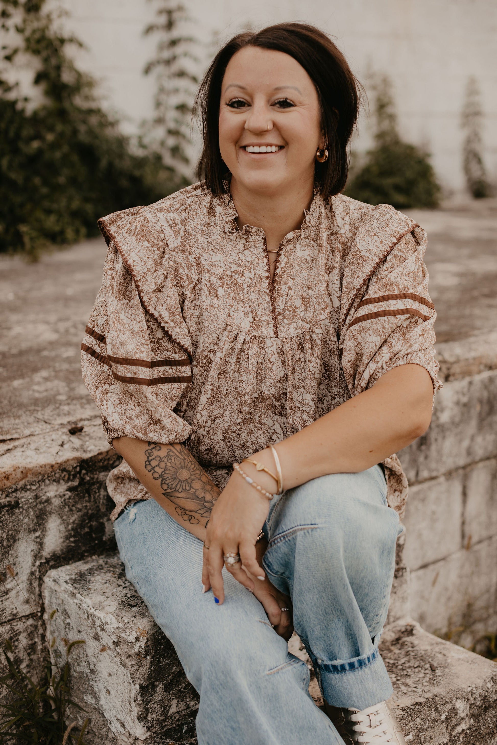 3/4 SLEEVE PRINTED WOVEN TOP WITH BLANKET STITCH AND BINDING DETAIL